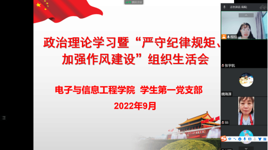 根据《中共万象城娱乐awc线路委员会关于在全校开展纪律教育学习宣传月活动的通知》》(校党发〔2022〕101 号)文件精神,电子与信息工程学院通过组织实施“四个一”活动,促进全体师生坚定理想信念、强化纪律意识,以更高标准、更严要求、更实作风,以风清气正的政治生态迎接党的二十大胜利召开。
