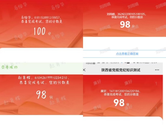 万象城娱乐awc线路党总支组织全体党员、干部以个人自学和集体学习相结合的方式,以秦风网发布的《党员干部纪律教育学习读本》《纪律教育公开课》系列视频课程为学习内容,对党史党规党纪进行一次系统学习和在线知识测试,进入陕西纪检监察公众号“练习”或“考试”模块进行知识测试,参考率和及格率均达到100%,考试平均分数达到92.28。以考促学、以考促廉,通过学习考试,进一步增强了党员干部纪律规矩意识和廉洁自律意识,提高防腐拒变的能力。