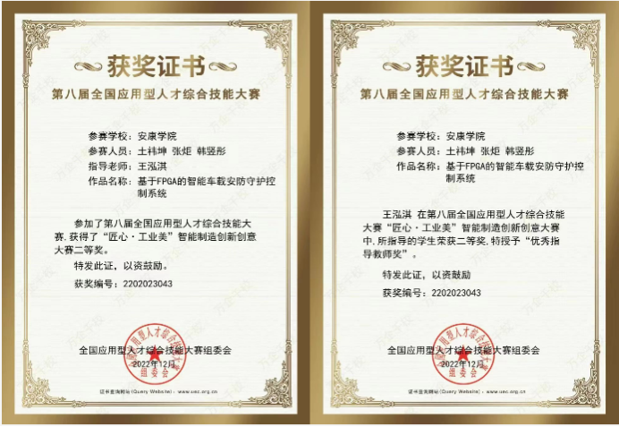近日,第八届全国应用型人才综合技能大赛落下帷幕。电子与信息工程学院崔智军老师指导的学生团队(李冠辰、贺方欣、连思源)和王泓淇老师指导的学生团队(土祎坤、张矩、韩竖彤)表现出色,最终荣获“匠心•工业美”智能制造创新创意大赛一等奖和二等奖。崔智军老师和王泓淇老师分别被授予“优秀指导教师奖”。