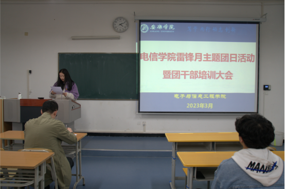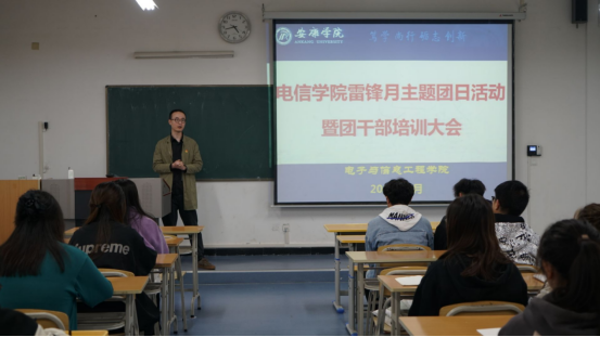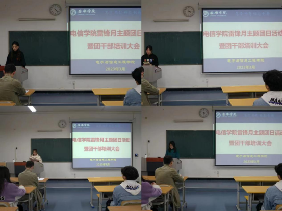 为积极培育和践行社会主义核心价值观,传承和弘扬雷锋精神,致敬时代先锋,引领团组织干部践行雷锋精神及奉献、友爱、互助、进步的志愿精神,电子与信息工程学院团总支于3月22日在江北校区1319教室开展以“传承雷锋精神 做新时代青年”为主题的团日活动暨团干部培训大会。学院团总支书记张宇航、副书记任柯伊、任金笑、组织部部长陈新茹、摄影部部长沈晓轩、编辑部部长李少博、以及各班团支书参加本次会议,本次会议由团总支副书记任金笑主持。
