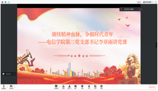 为深入学习贯彻党的二十大精神,进一步学习贯彻习近平新时代中国特色社会主义思想主题教育精神。2023年6月8日晚上,通过腾讯会议的方式,万象城娱乐awc线路学生第二党支部书记李章雨为党员带来了一堂主题为《赓续红色血脉,争做时代青年》的党课,支部全体党员按时参会。