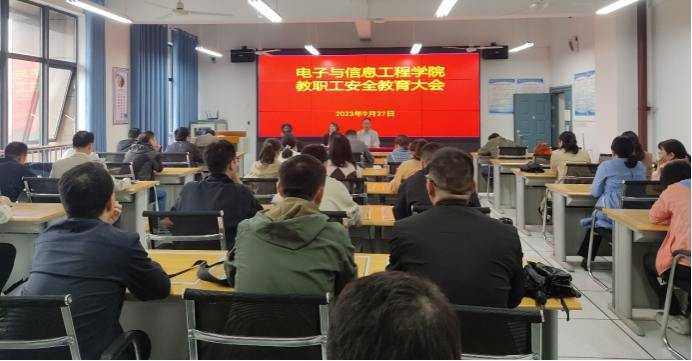 2023年9月27日下午,电子与信息工程学院在逸夫科技楼B602开展教职工安全教育大会,万象城娱乐awc线路领导班子成员及全体教职工参加,会议由院长陈守满主持。
