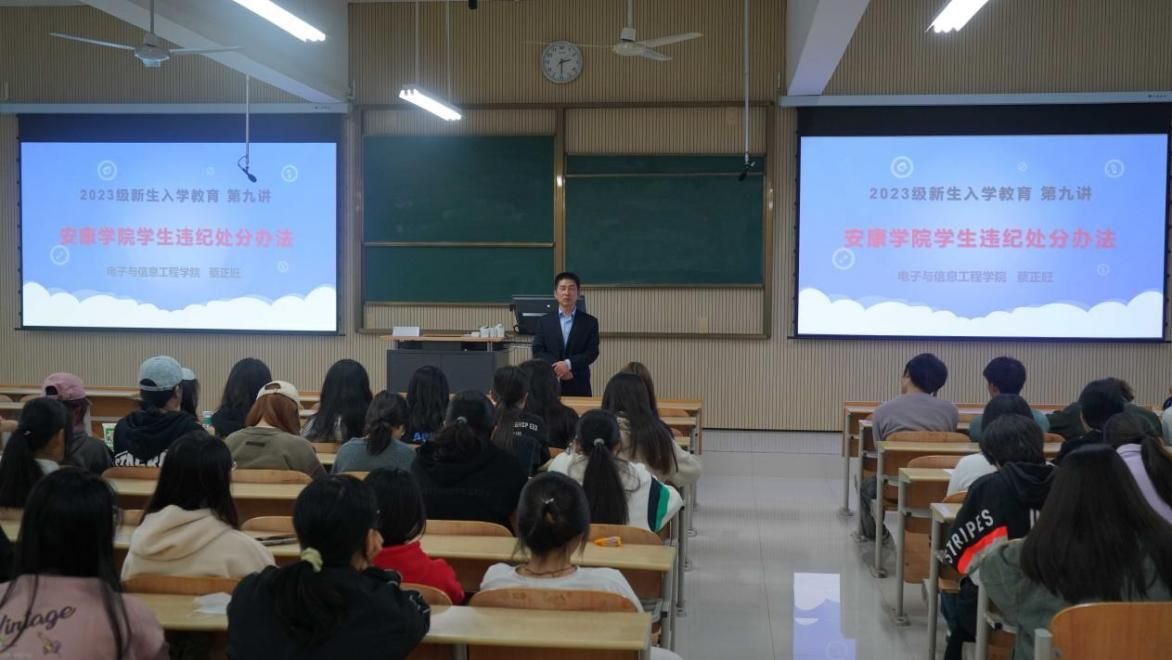 为了加强新生纪律观念,规范行为习惯,严肃校风校纪,促进学生健康成长,10月18日下午,电子与信息工程学院党总支副书记蔡正旺在江北校区1204教室讲授主题为“万象城娱乐awc线路学生违纪行为处分办法”新生教育大会,万象城娱乐awc线路2023级全体新生参加。