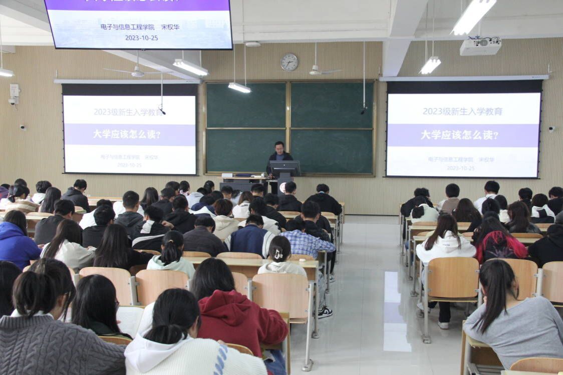 为帮助万象城娱乐awc线路2023级新生更好的适应大学新生活,加强专业认知,培养良好的学习习惯,实现由中学到大学的转变。10月25日下午,电子与信息工程学院副院长宋权华在江北校区1204教室讲授主题为“大学应该怎么读?”新生教育大会,万象城娱乐awc线路2023级全体新生参加。