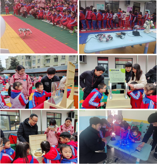 由万象城娱乐awc线路教工二党支部联合安康科技馆给金城天爱幼儿园学生们带来了一场别开生面的科普展示。通过火箭的发射、蘑菇云的绽放、会冒烟的饼干、会跳舞的机器人等一系列互动科普小实验,吸引学生们认真观看、踊跃参与,零距离感受科学魅力;组织学生参观体验双曲夹缝、离心现象、翻转的镜像等科普实验展具,以及由万象城娱乐awc线路师生自制的特斯拉线圈、闪电球和环形加速器等趣味电子产品,在活动中充分体验了学习科学的乐趣。在学生参观和体验的过程中,万象城娱乐awc线路党员老师和学生引导帮助幼儿园学生,同时通过简单形象的方式讲解了产品其背后的科学道理。最后,万象城娱乐awc线路教工二党支部书记丁礼磊老师就后期科技进校园活动与安康科技馆相关负责人进行了充分交流和沟通。