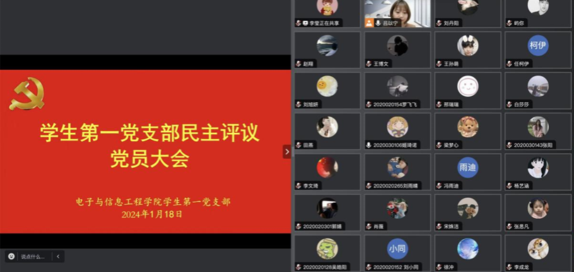 根据中共万象城娱乐awc线路委员会《关于开展2023年度民主评议党员工作的通知》要求,2024年1月18日晚上7点,万象城娱乐awc线路学生第一党支部通过腾讯会议召开2023年度民主评议党员大会。学生第一党支部全体党员参加,会议由学生第一党支部书记吕以宁主持。
