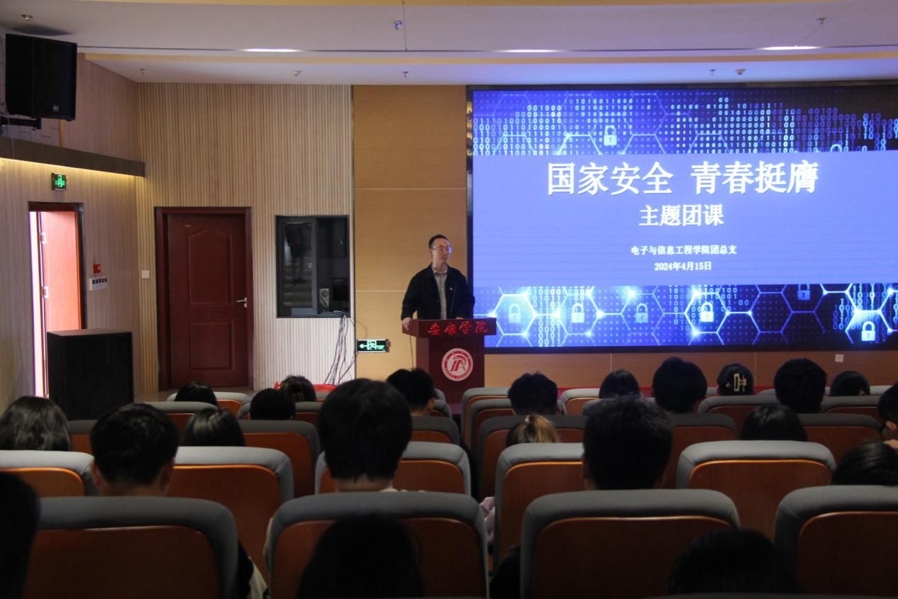 在第九个全民国家安全教育日来临之际,为深入学习习近平总书记关于总体国家安全观的重要论述,不断增强学生国家安全意识,筑牢国家安全防线,努力营造“国家安全,人人有责”的良好氛围,4月15日,电子与信息工程学院团总支在江北校区图书馆报告厅开展了以“国家安全 青春挺膺”为主题的国家安全主题团课。学院团总支书记张宇航主讲,100余名在校团员青年代表参加学习。