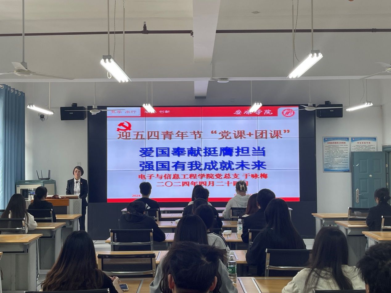 为庆祝中华人民共和国成立75周年,中国共产党成立103周年,中国共青团成立102周年,号召青年学生以实际行动迎接五四青年节,2024年4月24,电子与信息工程学院党总支书记于咏梅在科技楼B602为学生干部、入党积极分子、发展对象上了一堂主题为“爱国奉献挺膺担当 强国有我成就未来”的党课+团课。电子与信息工程学院团总支、学生会、班团干部、入党积极分子、发展对象共计60余人参会。