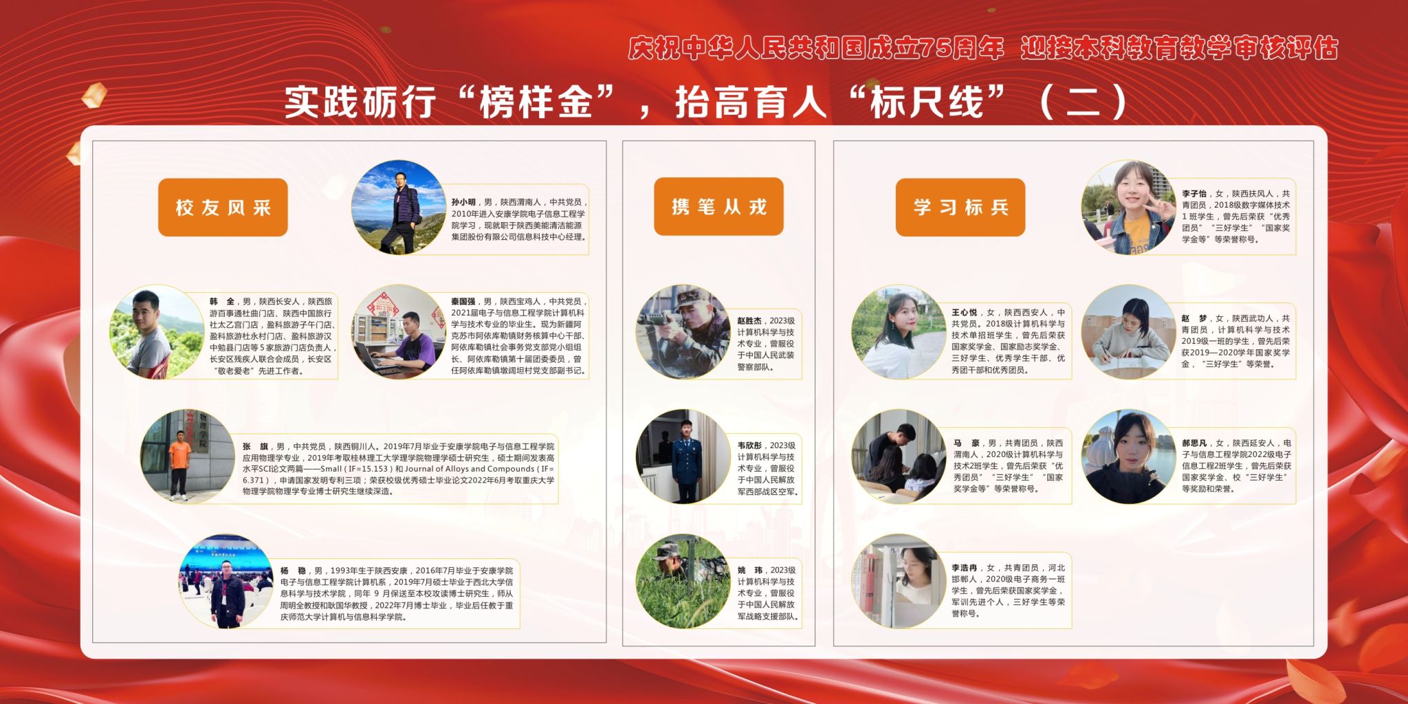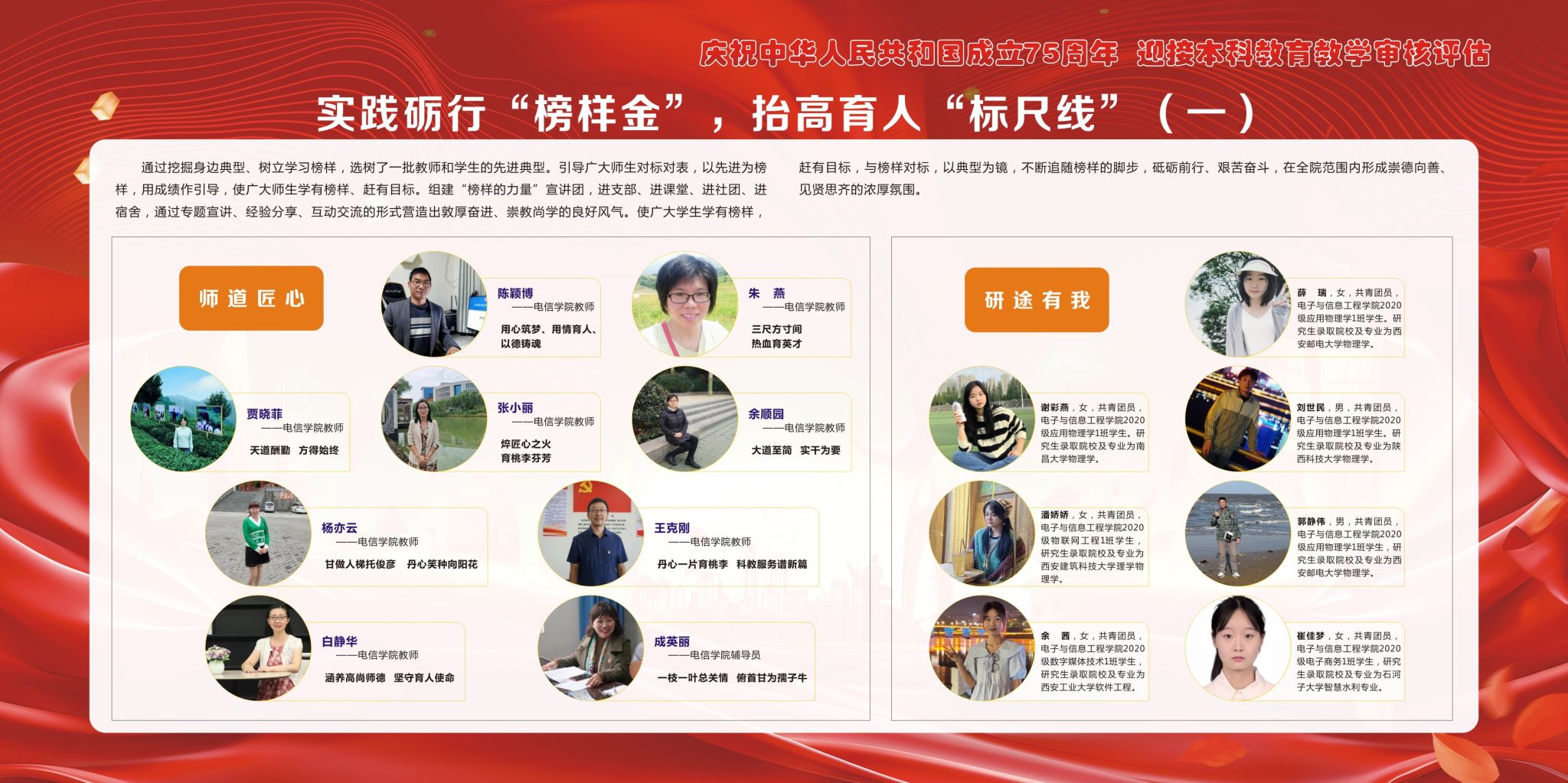 以“榜样金”为特色,助力电信学子追光前行。发挥榜样引领作用,传递青春奋进力量。通过先进人物评选、优秀成果展示、感人事迹宣传,以先进为榜样,用成绩作引导。学院从“师道匠心”、“校友风采”、“携笔从戎”、“学习标兵”“研途有我”五个方面树立典型,使广大学生学有榜样,赶有目标,与榜样对标,以典型为镜,不断追随榜样的脚步,砥砺前行、艰苦奋斗,在全院范围内形成崇德向善、见贤思齐的浓厚氛围。