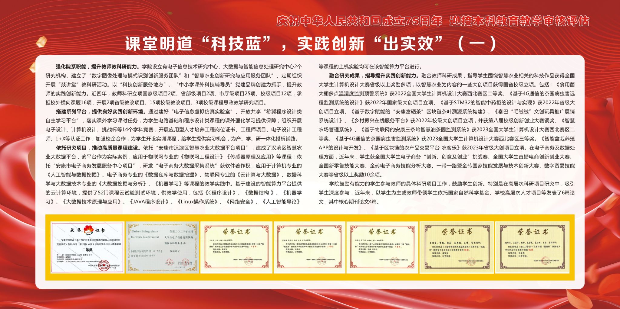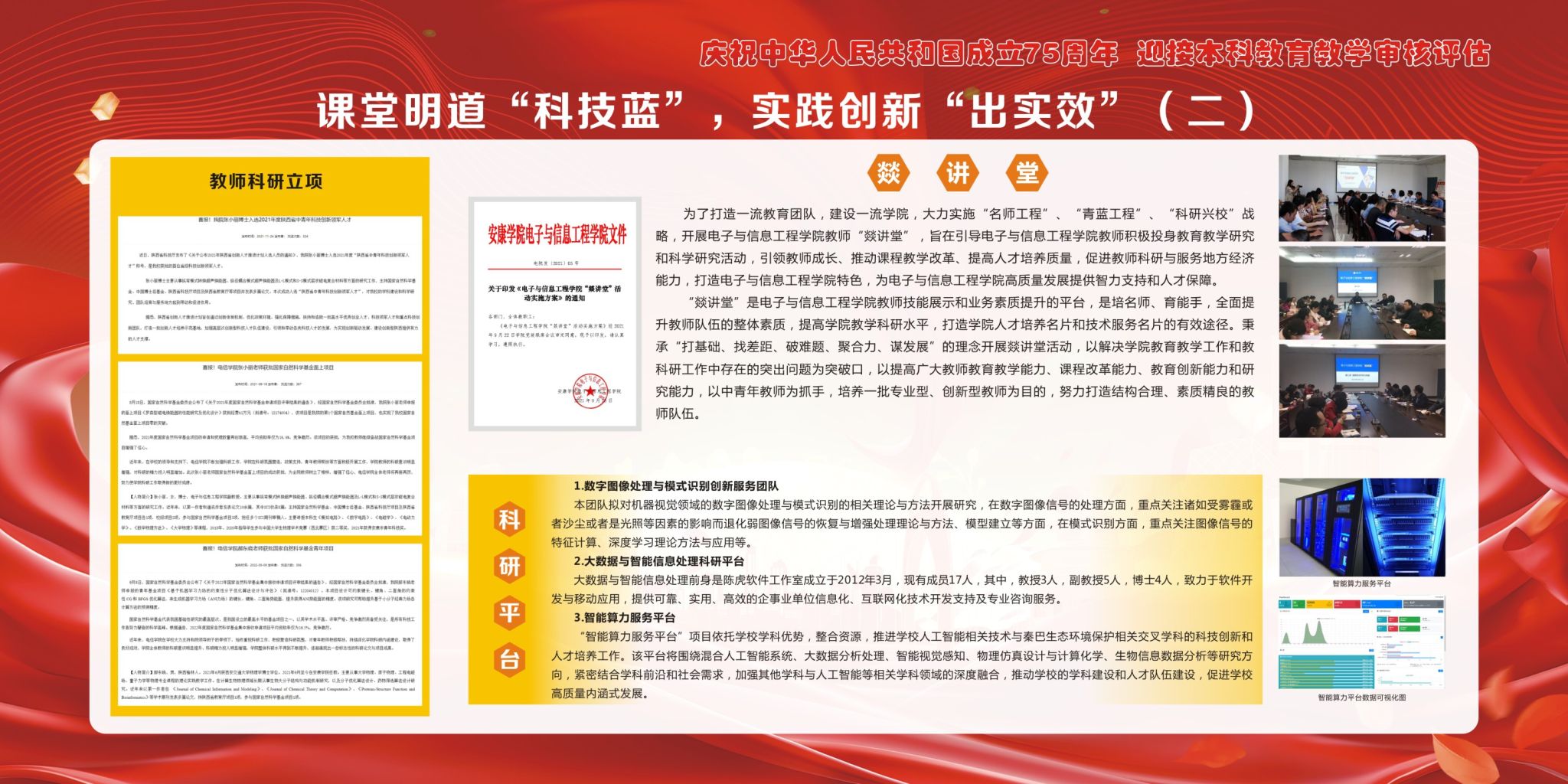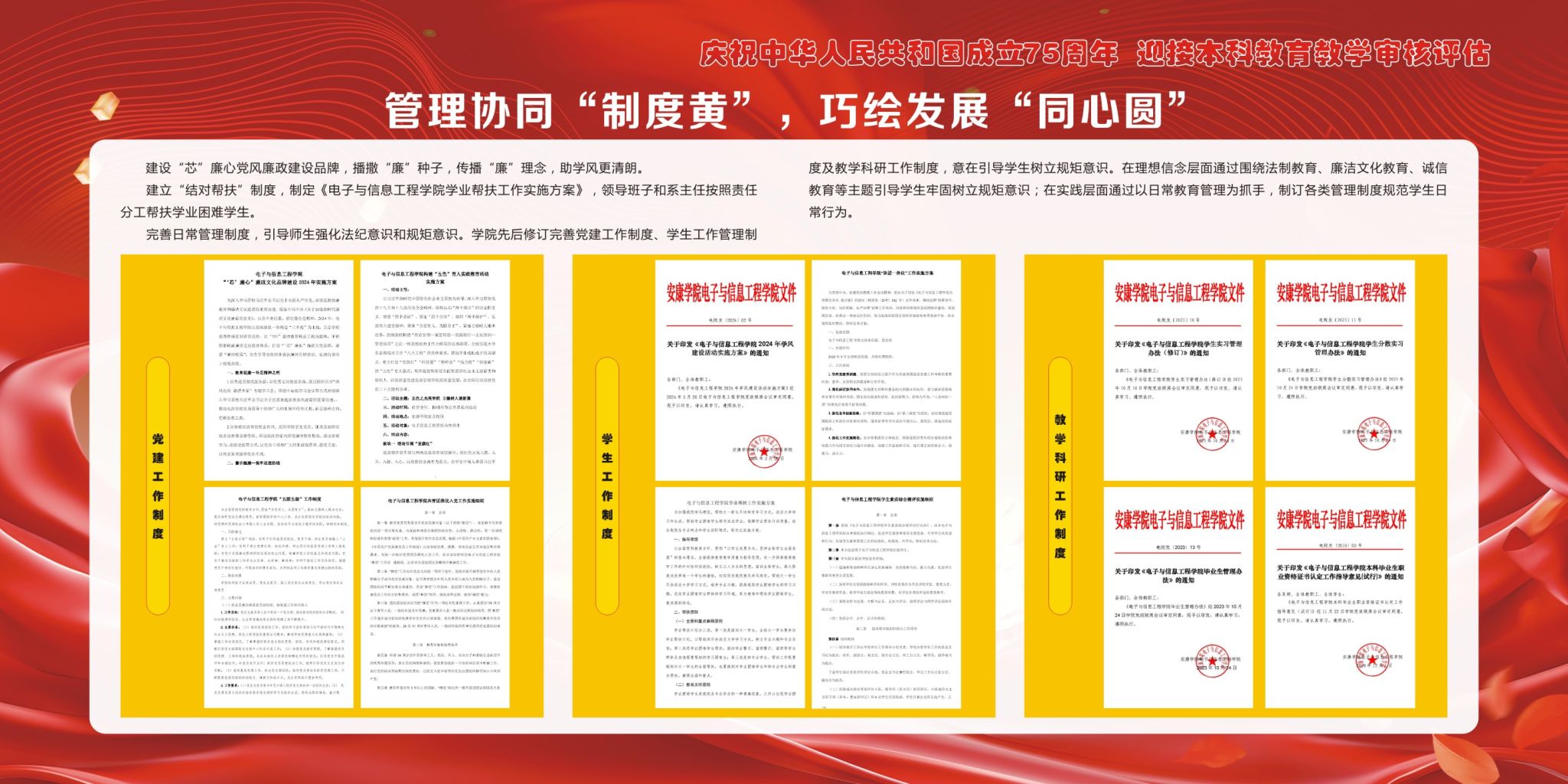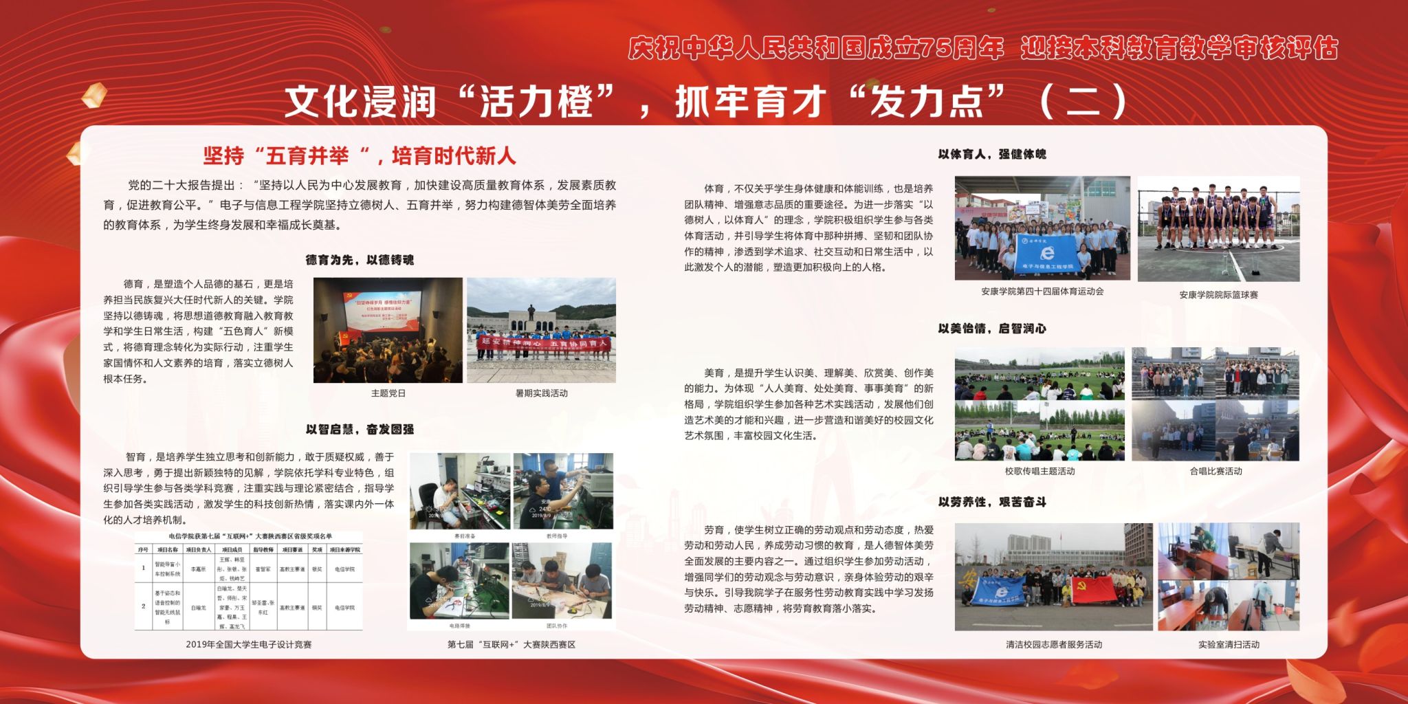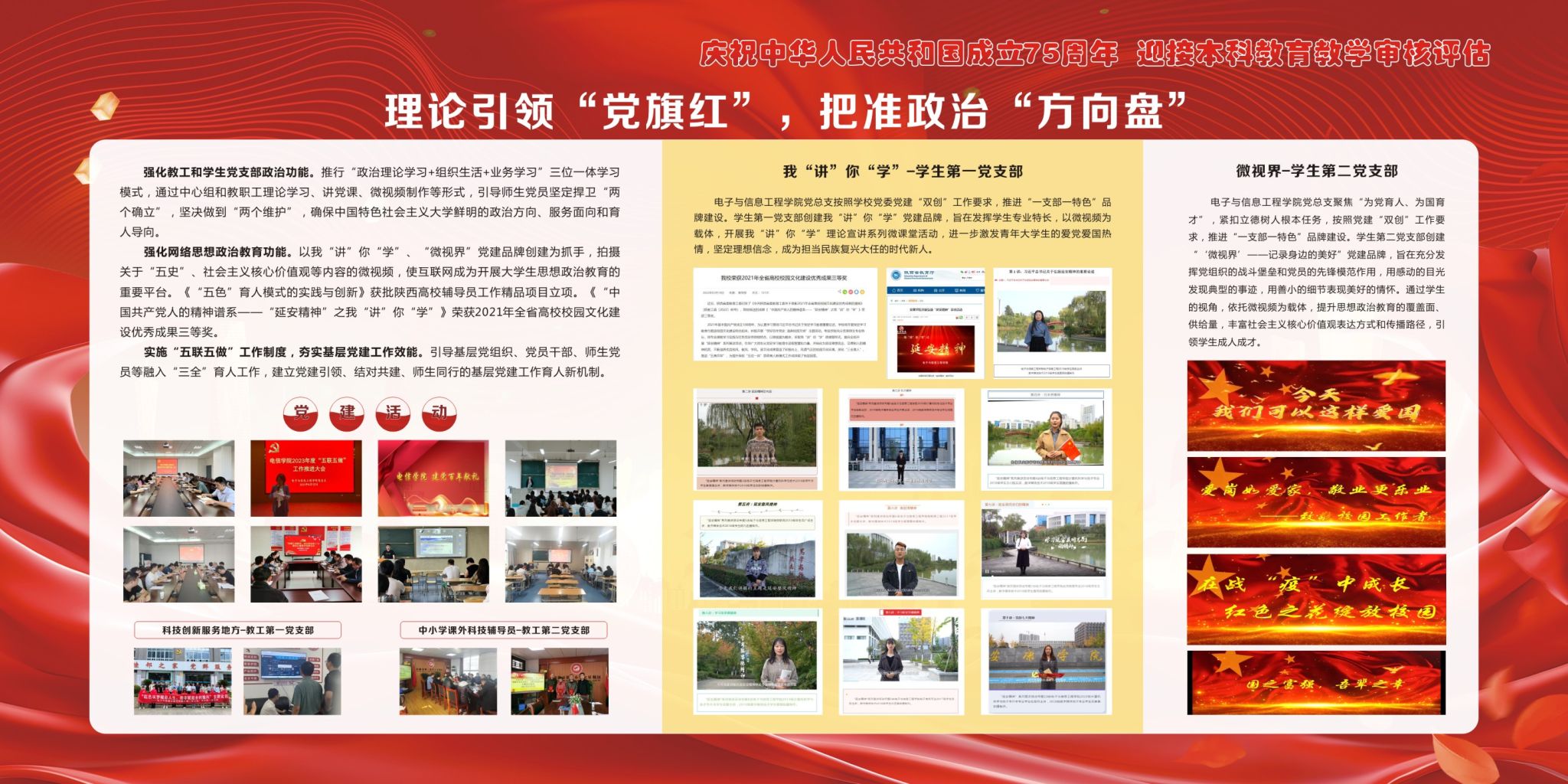 后面的9块展板向学生及家长介绍了近年来电子与信息工程学院始终坚持围绕学校中心工作,聚焦“为党育人、为国育才”,紧扣立德树人根本任务,积极探索“五色”育人模式,切实将“党建+思政”融入到人才培养工作之中,为扎实做好各项工作提供有力保障的一些成果。