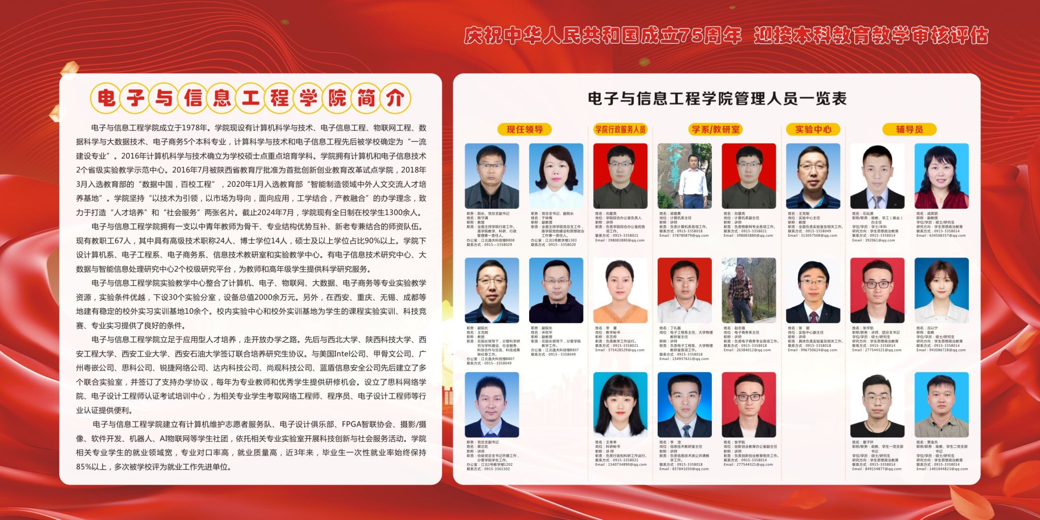 第一块展板向新生及家长简要介绍了学院基本情况,包括现任领导、学院行政服务人员、学系/教研室负责人、实验中心负责人以及专职辅导员老师。