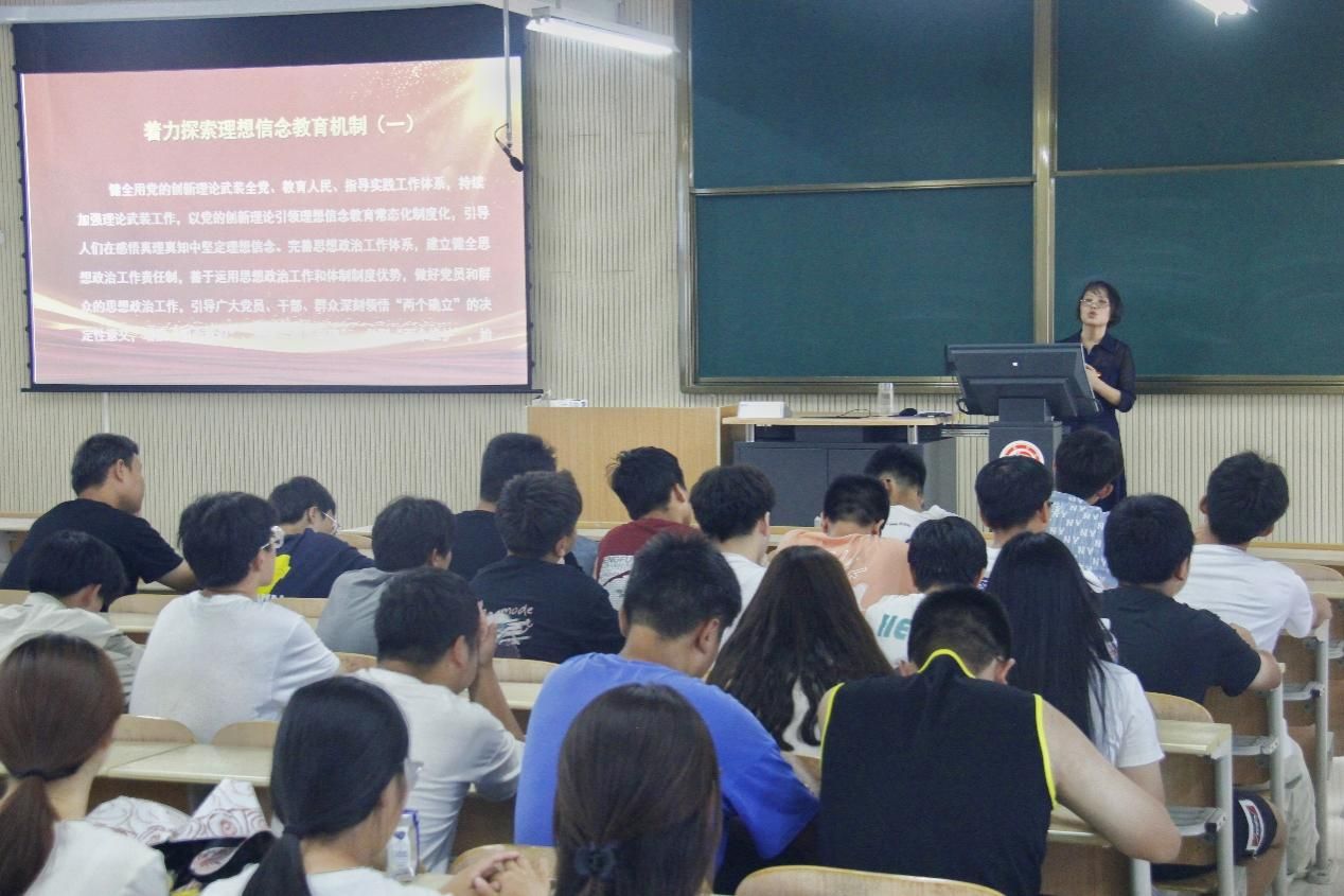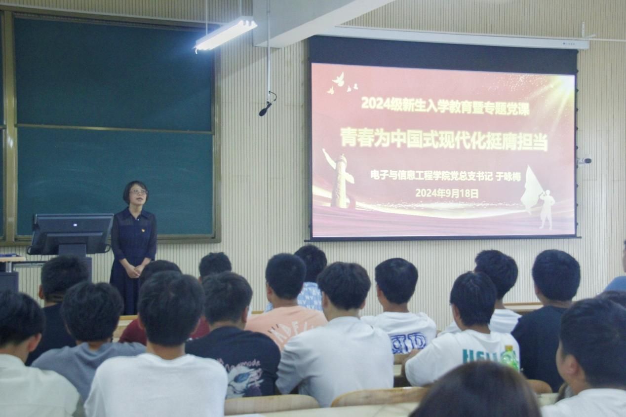 为深入学习贯彻党的二十届三中全会精神,用习近平新时代中国特色社会主义思想和习近平总书记2024年五四青年节的重要讲话武装青年大学生,坚持立德树人根本任务,以“五色”育人模式的实践与创新引领青年大学生奋力书写为中国式现代化挺膺担当的青春篇章,9月18日下午,万象城娱乐awc线路党总支书记于咏梅在江北校区1301、1404教室讲授主题为青春为中国式现代化挺膺担当的专题党课暨新生入学教育,万象城娱乐awc线路2024级全体新生参加。万象城娱乐awc线路辅导员成英丽主持。