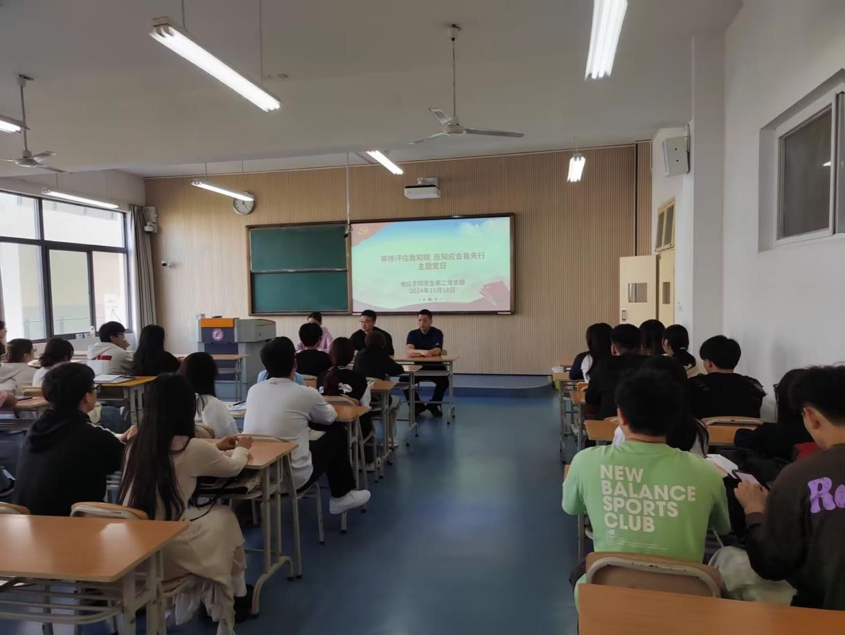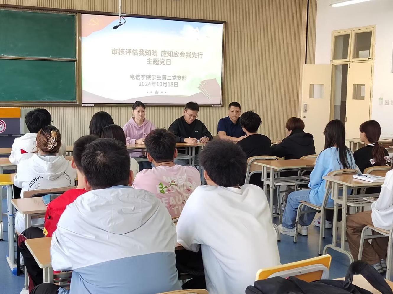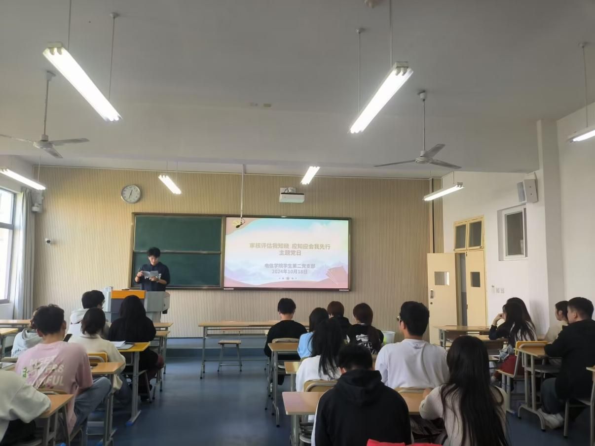 为积极开展迎评促建工作,全员全环节全力推进审核评估,落实立德树人根本任务,营造全院上下“人人关心评估、人人了解评估、人人参与评估”的浓厚氛围。2024年10月18日,万象城娱乐awc线路学生第二党支部在一号教学楼1320教室开展了“审核评估我知晓,应知应会我先行”主题党日活动暨政治理论学习。会议由学生第二党支部书记贾金兵主持,学生第二党支部全体党员、入党积极分子、发展对象参与。