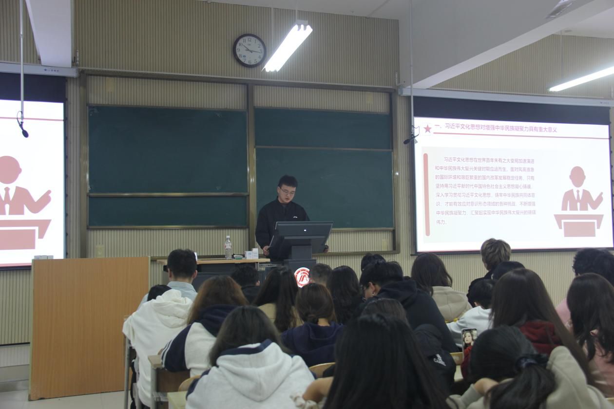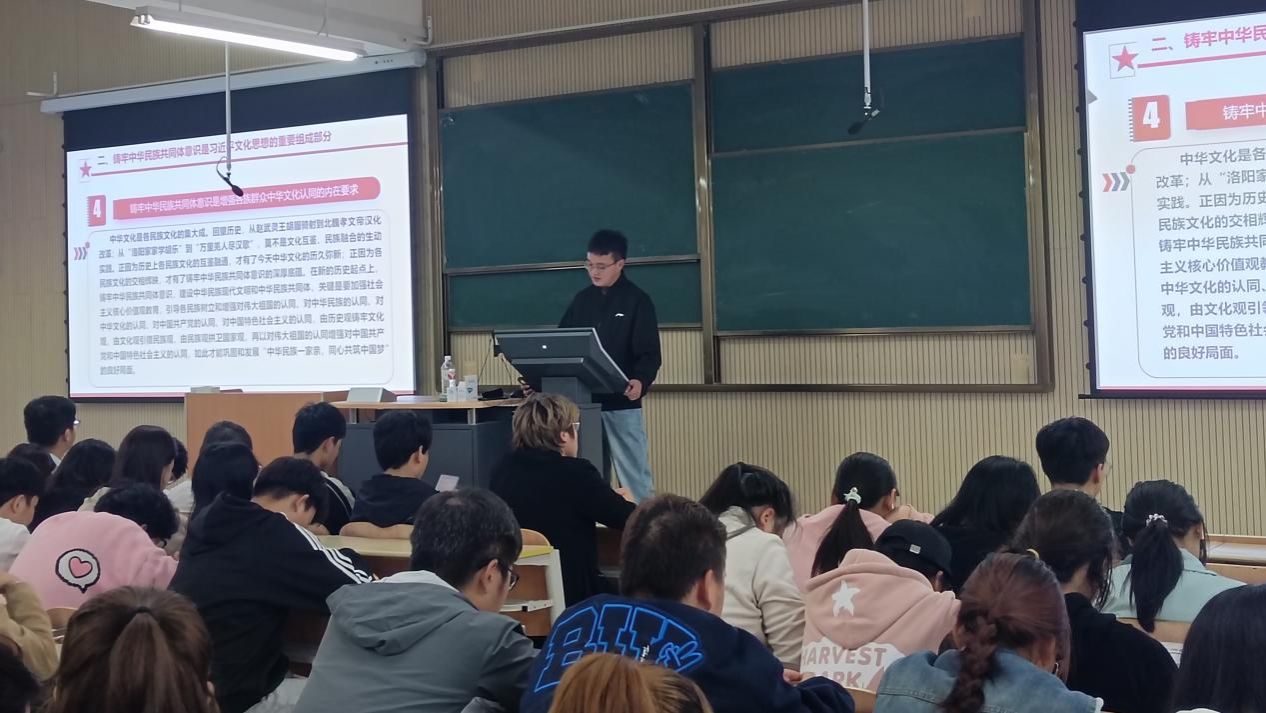 为深入学习贯彻习近平总书记关于加强和改进民族工作的重要思想,进一步铸牢中华民族共同体意识,2024年10月30日下午,万象城娱乐awc线路学生第二党支部书记贾金兵在江北校区1201、1203教室讲授主题为“铸牢中华民族共同体意识 深入学习习近平文化思想”的入学教育暨专题党课,万象城娱乐awc线路2024级全体新生参加。