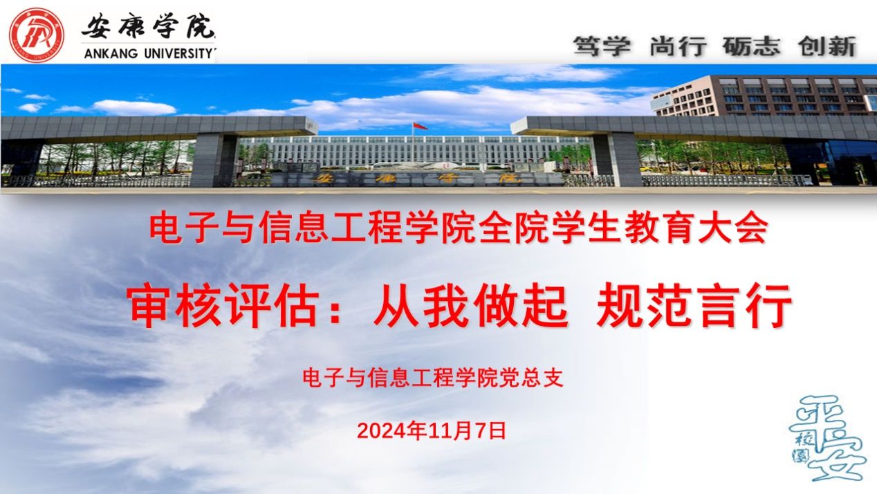 为全面落实本科教育教学审核评估工作要求,营造浓厚的迎评促建氛围,扎实做好本科教育教学审核评估工作期间学生思想政治工作,广泛凝聚共识,万象城娱乐awc线路于11月7日召开主题为“审核评估:从我做起 规范言行”的全院学生教育大会。参加此次大会的有万象城娱乐awc线路党总支书记于咏梅,副书记蔡正旺,学生工作(就业工作)办公室主任石纭昊,团总支书记(创新创业工作办公室主任)张宇航,党总支组织委员、辅导员成英丽,学生第一党支部书记、辅导员翟子轩,学生第二党支部书记、辅导员贾金兵,团总支、学生会、社团服务中心全体学生干部,2022、2023、2024年级班团干部、宿舍长。会议由学生工作(就业工作)办公室主任石纭昊主持。
