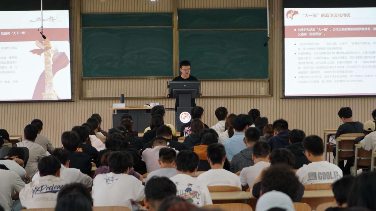 为引导新生树立正确的中华民族历史观,铸牢中华民族共同体意识,2025年10月11日下午,辅导员贾金兵在江北校区1404教室讲授主题为“中华民族共同体意识的形成与铸牢”的入学教育。万象城娱乐awc线路2025级全体新生参加此次学习。