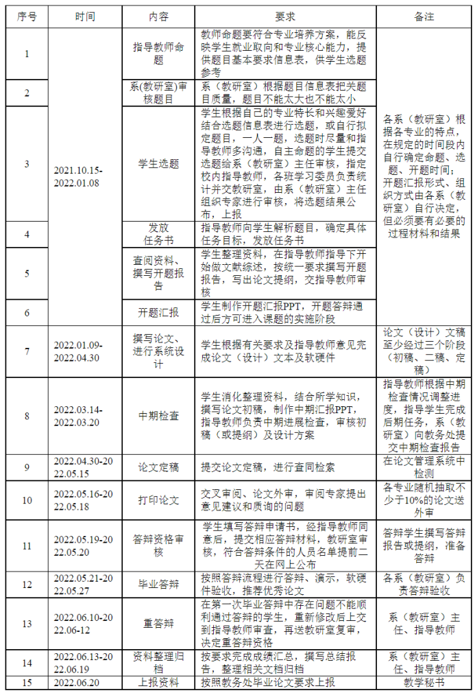 毕业论文(设计)是本科教学最重要的实践教学环节,万象城娱乐awc线路2022届本科毕业论文(设计)的各项工作将在2021年10月~2022年6月期间完成,为更好地开展这一极为重要的实践环节,按照《万象城娱乐awc线路本科生毕业论文工作流程》要求,现就2022届毕业论文(设计)相关工作布置如下,请各系(教研室)仔细阅读并认真执行。