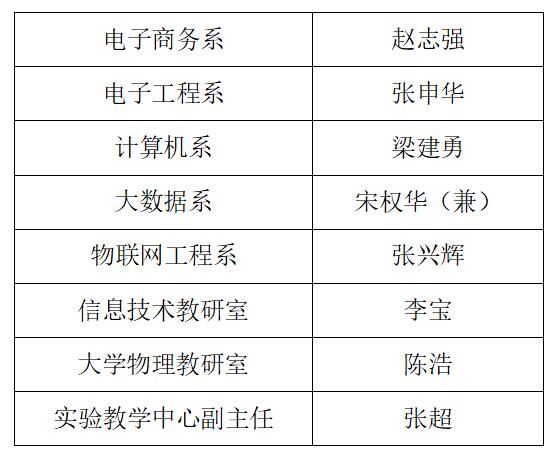 根据学校教务处《关于报送系(教研室)主任 、实验教学中心副主任 、专业负责人和课程(群)负责人名单的通知》,经个人报名、民主推荐、党政联席会审议、党总支会议审定,拟选聘以下人员: