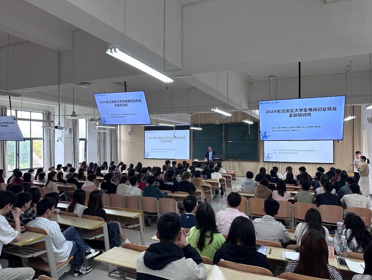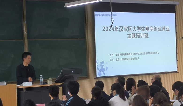 为响应国家关于促进大学生创业就业的号召,进一步激发学生创新创业热情,培养学生创新创业精神,提升学生创新创业能力,电子与信息工程学院于4月13日至4月14日在1204教室成功举办了“2024年汉滨区大学生电商创业就业主题培训”。本次培训由电子与信息工程学院、汉滨区电子商务服务中心主办,惟亚(上海)数字科技有限公司承办,邀请“素言聚量电商”创始人张瀛为万象城娱乐awc线路电子商务专业200余名学生进行了培训。在培训开班仪式上,由电子与信息工程学院电子商务系主任赵志强老师主持,汉滨区数字经济产业园、汉滨区电子商务服务中心主任李龙,电子与信息工程学院副院长王克刚、党总支副书记蔡正旺,汉滨区数字经济产业园、汉滨区电子商务服务中心经济部部长张亮,惟亚(上海)数字科技有限公司项目负责人李永瑶,辅导员翟子轩、培训讲师张瀛及电商运营中心成员、电子商务专业学生参加了开班仪式。